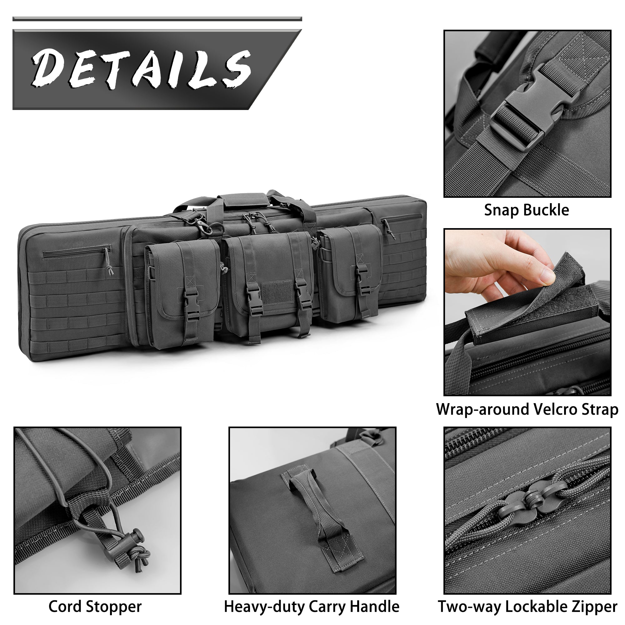 This tactical rifle case is spacious enough to hold multiple firearms and ammo. Two main compartments can accommodate 2 long guns such as rifles, shotguns, carbines and supplies like pistols, handguns, goggles, log books and cleaning kits. Exterior with 2 pockets and 3 pouches adds extra storage space for other tools.